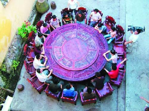 磐安人張昔強(qiáng)和他的47位同事在過去的三年時(shí)間里,不舍晝夜,致力于一張紅木大圓桌的制作。張昔強(qiáng)十多歲就開始了木雕生涯, 36歲的他如今已成為了一位木雕老師傅。技藝嫻熟、老練的張師傅帶領(lǐng)他的團(tuán)隊(duì),經(jīng)過1000多個(gè)日日夜夜的奮戰(zhàn),終于使紅木大圓桌圓滿完工。張昔強(qiáng)團(tuán)隊(duì)用了三年時(shí)間向紅木大圓桌融注了其高超的制作工藝,打造了一件紅木千年不朽之作,不僅向世人昭示了中華傳統(tǒng)家具制作工藝的極致境界,更創(chuàng)造了可供千年鑒賞、千年傳承的不朽傳奇。