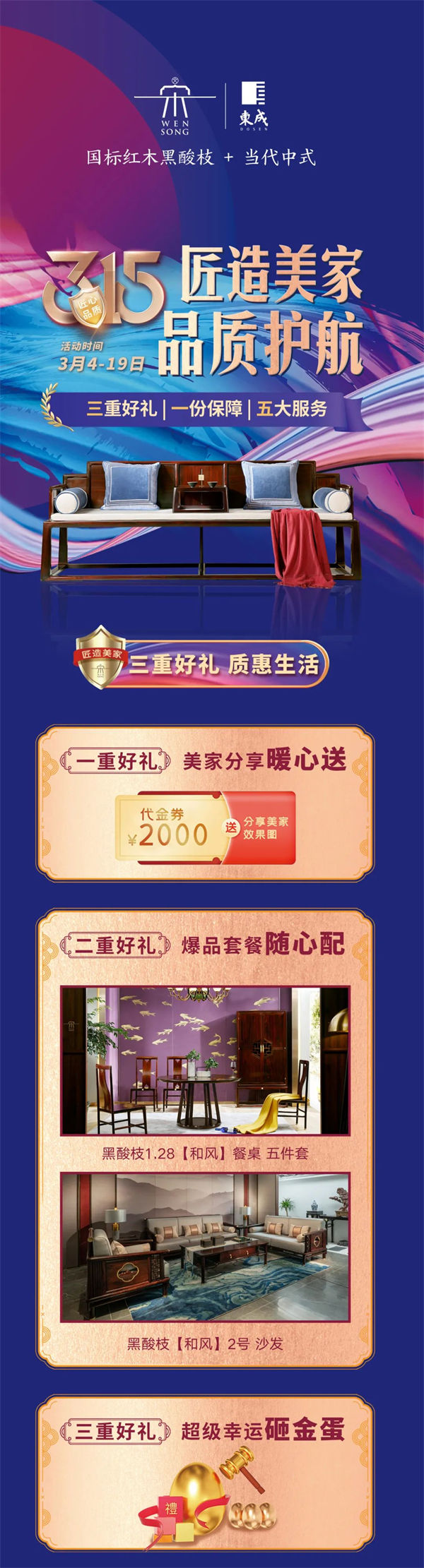 春暖花開,三月已至,東成文宋特別推出主題為“315 匠造美家 品質護航 ”的活動?;顒訒r間從3月4日至3月19日,感恩回饋,如約而至。