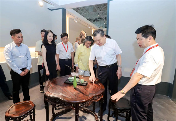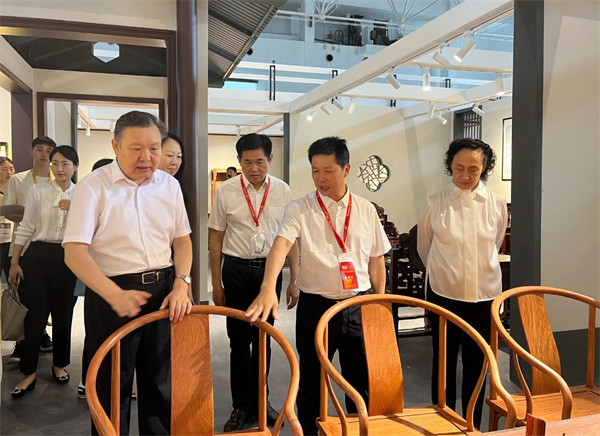 展會開幕,中國家具協(xié)會理事長徐祥楠,中國家具協(xié)會副理事長張冰冰,中國家具協(xié)會副理事長兼秘書長屠祺等一行領(lǐng)導(dǎo)在中國傳統(tǒng)工藝大師、中國家具協(xié)會副理事長、中國家具協(xié)會傳統(tǒng)家具專業(yè)委員會主席團(tuán)執(zhí)行主席、東成紅木董事長張錫復(fù)的陪同下,蒞臨東成紅木展位參觀指導(dǎo)。張董向中國家具協(xié)會理事長徐祥楠等一行領(lǐng)導(dǎo)介紹了精品家具的設(shè)計(jì)理念、選材標(biāo)準(zhǔn)和工藝細(xì)節(jié)等亮點(diǎn)。領(lǐng)導(dǎo)一行給予這次展品“選材之精,造型之美,工藝之優(yōu)、文化之深”的一致好評,并稱贊東成紅木以產(chǎn)品、空間、文化等多維度展現(xiàn)了當(dāng)下中國紅木家具產(chǎn)業(yè)發(fā)展成果,更體現(xiàn)了中國傳統(tǒng)工藝美學(xué)的大國匠心。