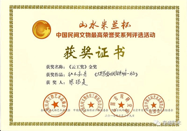 由中國(guó)明式家具知名學(xué)者濮安國(guó)與中國(guó)傳統(tǒng)工藝大師張錫復(fù)大師聯(lián)名設(shè)計(jì)的明式經(jīng)典書(shū)房家具首次于第20屆北京中國(guó)古玩藝術(shù)品博覽會(huì)展出,并一舉榮獲中國(guó)民間文物藝術(shù)品最高榮譽(yù)——云工獎(jiǎng)金獎(jiǎng)。