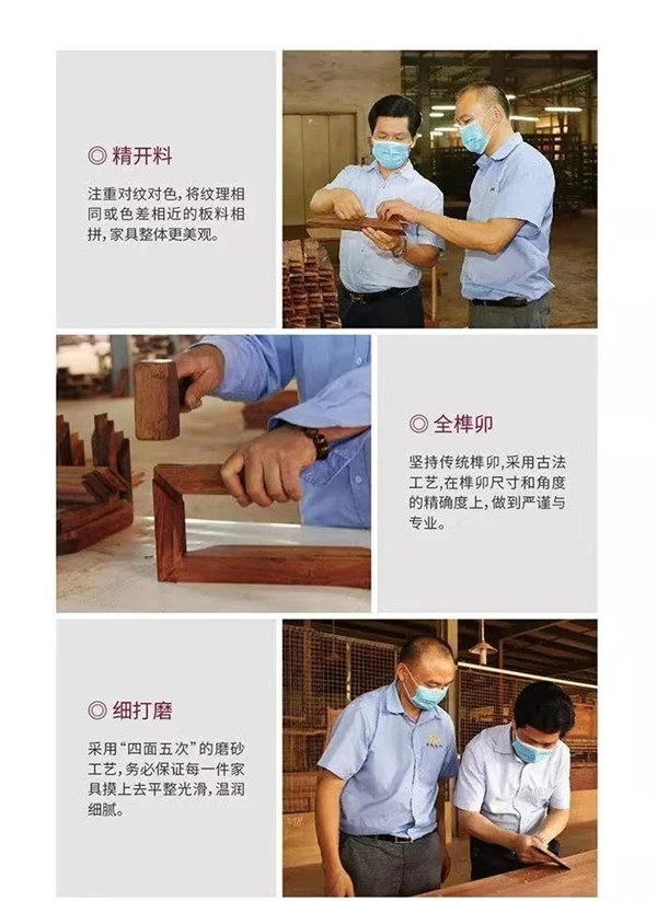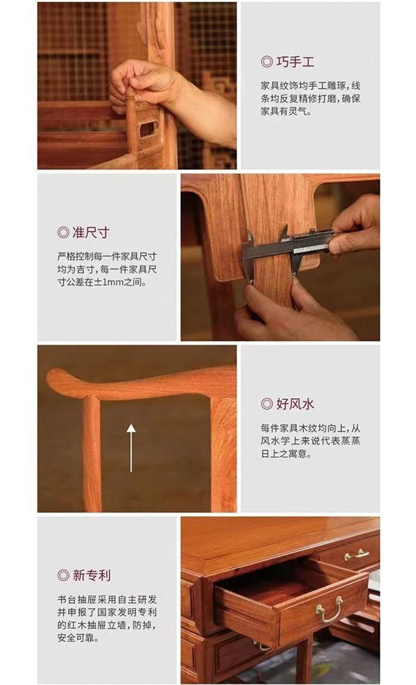 “傳統(tǒng)技藝是制器的關(guān)鍵。在東成紅木,創(chuàng)新的是家具形態(tài),堅(jiān)守的是傳統(tǒng)的技法,一個(gè)榫卯都不簡(jiǎn)化?!边@是中國(guó)傳統(tǒng)工藝大師、東成紅木董事長(zhǎng)張錫復(fù)對(duì)產(chǎn)品的工藝要求。這種要求也成就了大師書(shū)房。嚴(yán)格的工藝標(biāo)準(zhǔn),讓大師書(shū)房在細(xì)節(jié)上無(wú)懈可擊,盡善盡美。